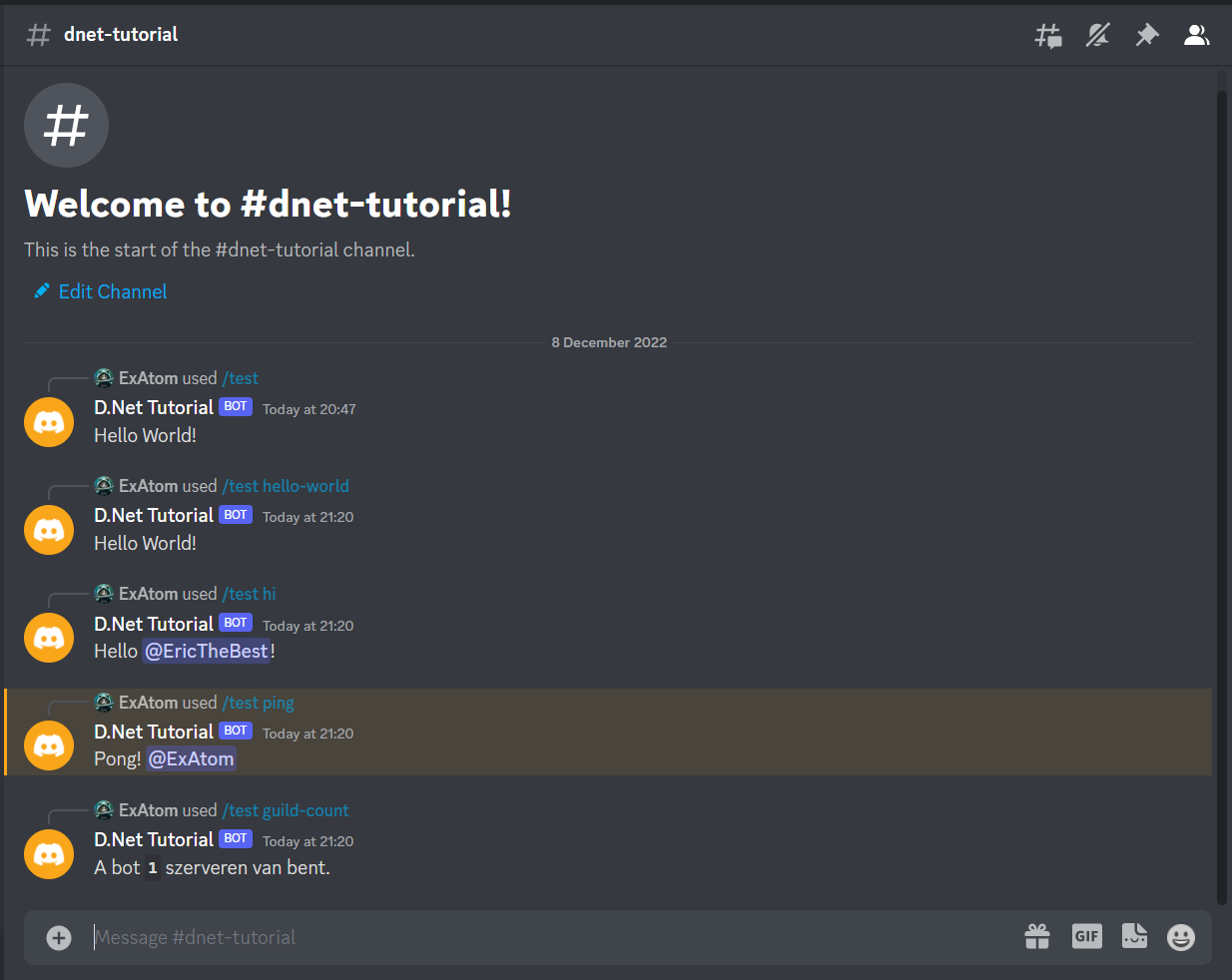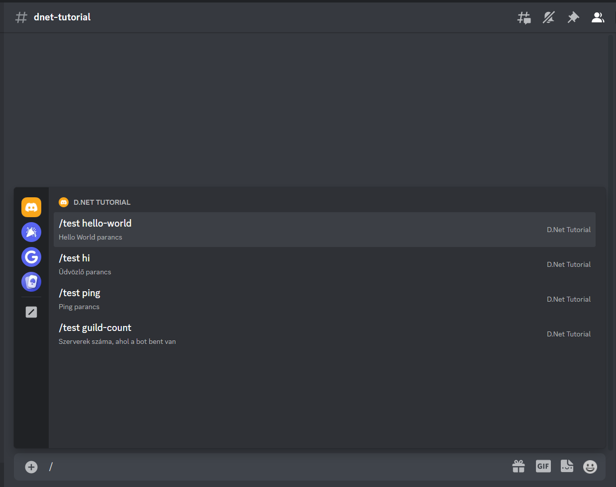 Végül nézzük meg Discordon, hogy mit alkottunk. A parancsok mind megjelennek ugyan abban a kategóriában.