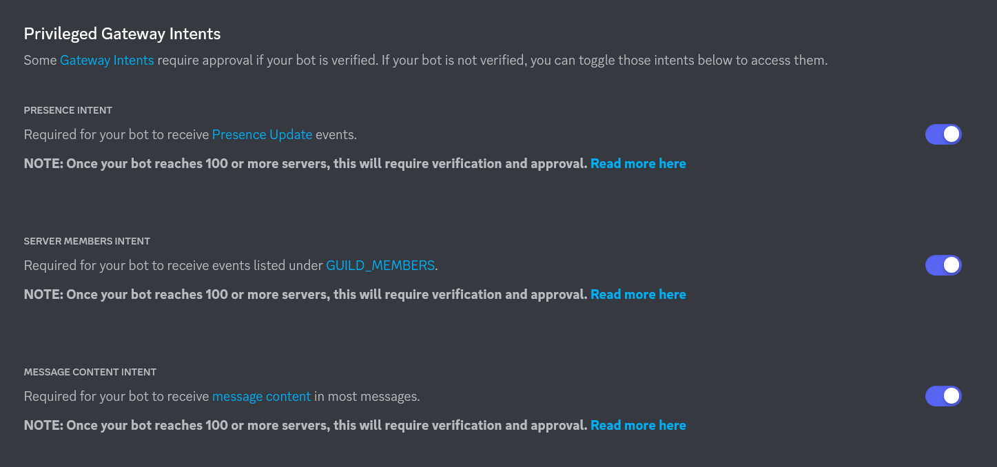 Ezen az oldalon sok hasznos beállítást találunk. Mindegyikhez van egy kis leírás, de a legfontosabbak a Privileged Gateway Intents részben találhatóak. Ezek bekapcsolásával a botunk több dologgal fog tudni foglalkozni, de ha több, mint 100 szerverre behívnák, akkor ezekhez engedélyt kell majd kérni. Tanuláshoz nyugodtan be lehet kapcsolni mindet.
