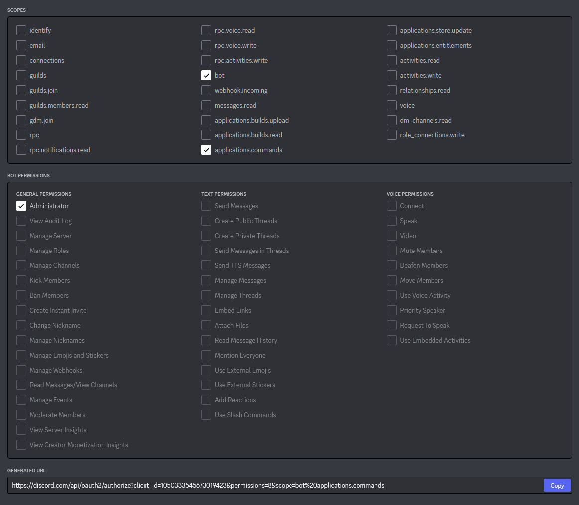 A Bot Permissionök közül az egyszerűség kedvéért válasszuk ki az Administratort. Persze, ha rendes botot készítenénk, akkor csakis a szükségeseket kapcsoljuk be.